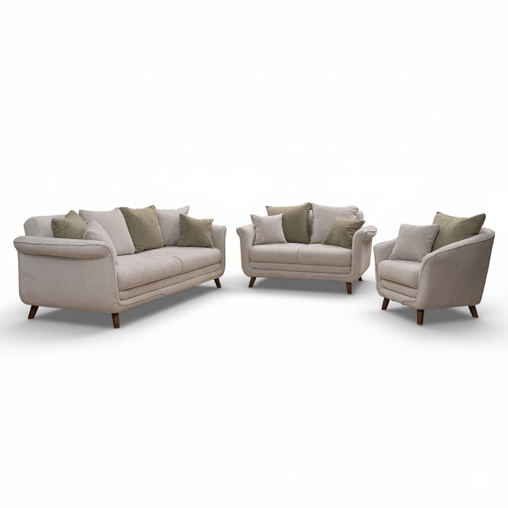 TDF Anja Garnitura modernog dizajna, sa drvenim nogarima. Sastoji se iz kompleta trosed, dvosed i fotelja.