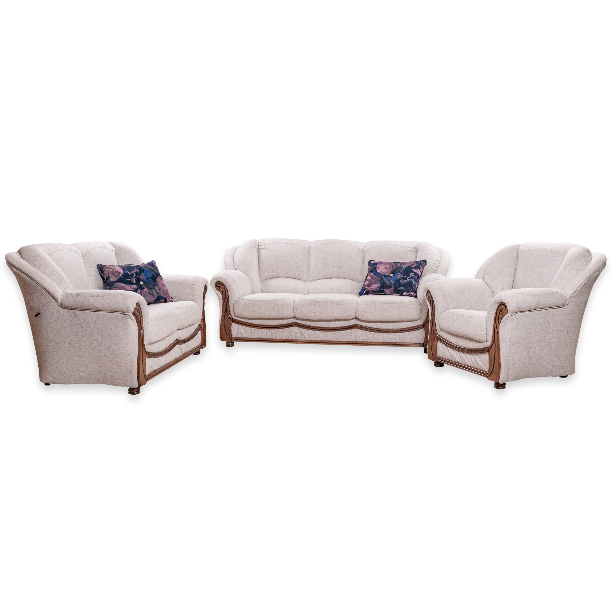 TDF Saška – Garnitura klasičnog, elegantnog dizajna, sa drvenim nogarima i aplikacijama. Sastoji se iz kompleta trosed, dvosed i fotelja. Postoji mogućnost kupovine zasebnih elemenata, kao i kombinacije boja, dezena… Veoma udobna, sedeći deo sunđer (gustina 30). Veliki izbor materijala. Na trosedu latoflex mehanizam. Jastuci nisu uključeni u cenu.Drvena konstrukcija omogućava čvrstoću i dugotrajnost. Trosed se rasklapa u ležaj za spavanje. Drvene aplikacije uvek u braon boji.
