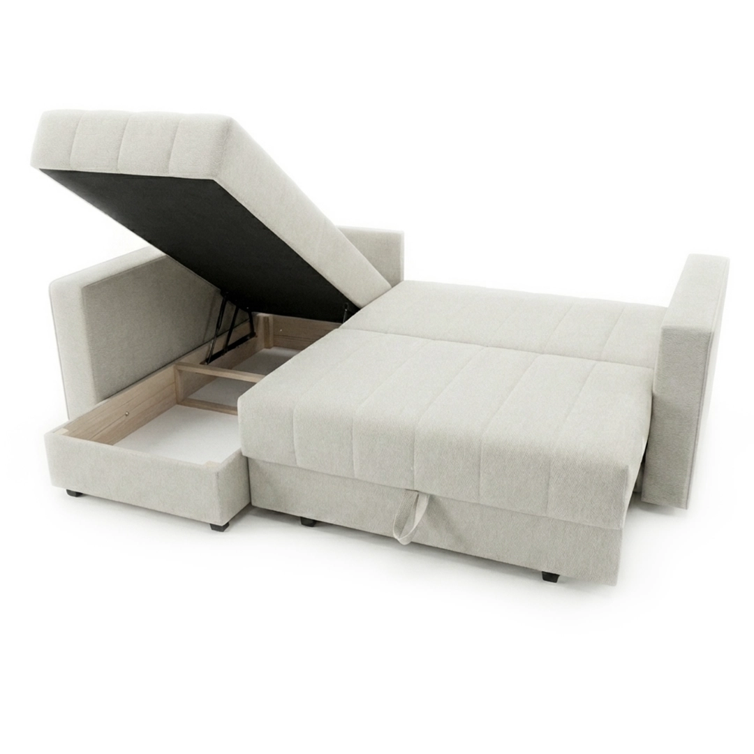 Ugaona garnitura Aki – Ugaona garnitura sa žičanim jezgrom pruža izuzetnu udobnost i dugotrajnost, zahvaljujući kvalitetnoj drvenoj konstrukciji i pouzdanom mehanizmu za razvlačenje. Idealna je za svakodnevno sedenje i povremeno spavanje. Kupci imaju mogućnost izbora boje i vrste štofa, kako bi garnitura savršeno odgovarala svakom enterijeru.