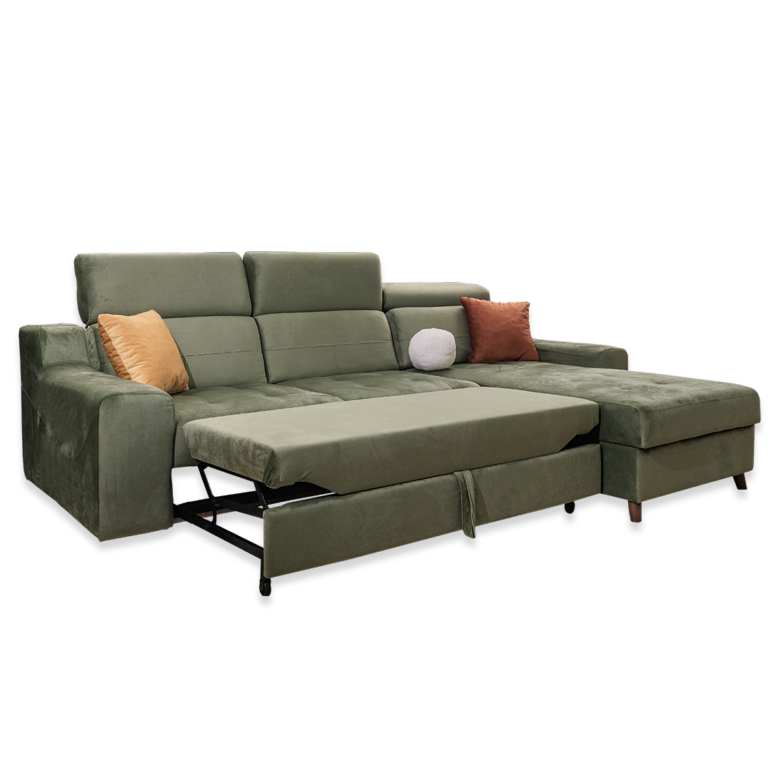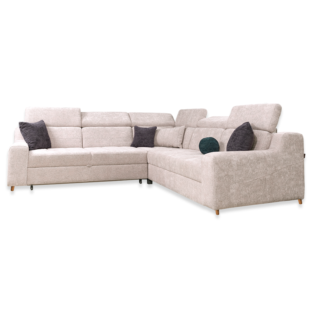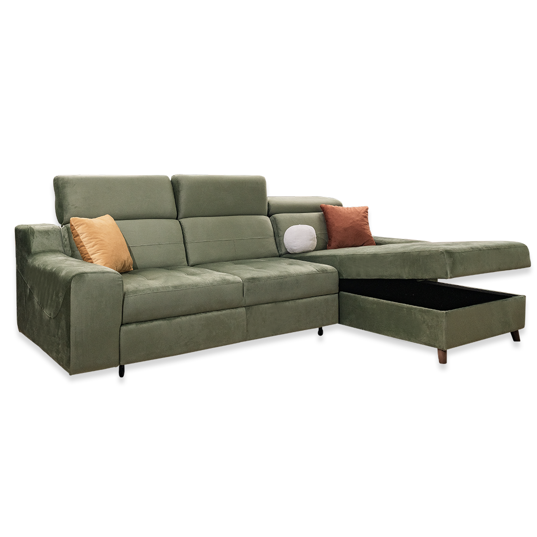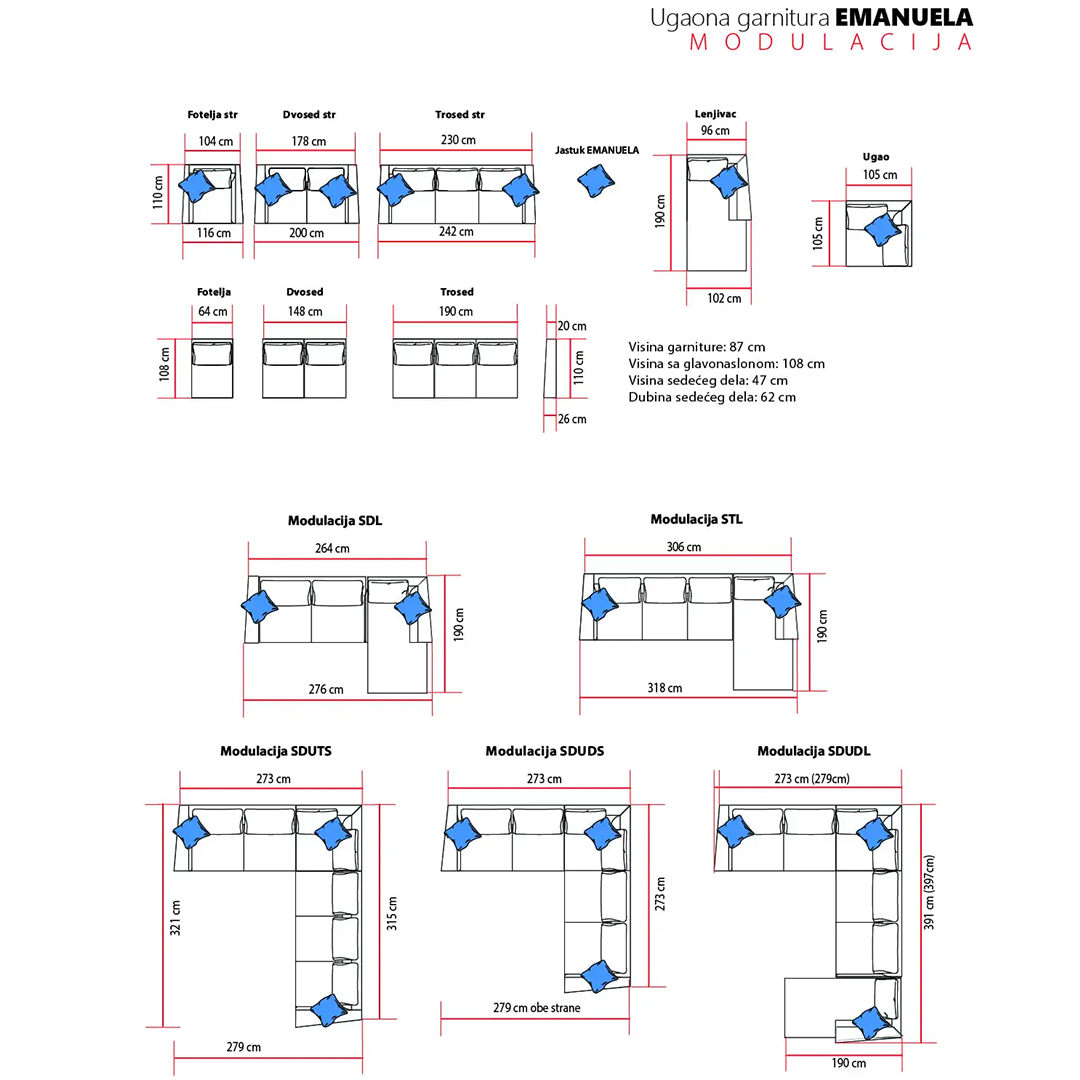 Modularna ugaona garnitura EMANUELA koja je dostupna u raznim dimenzijama. Praktična i udobna, rasklapa se za spavanje i ima kutiju za odlaganje.
