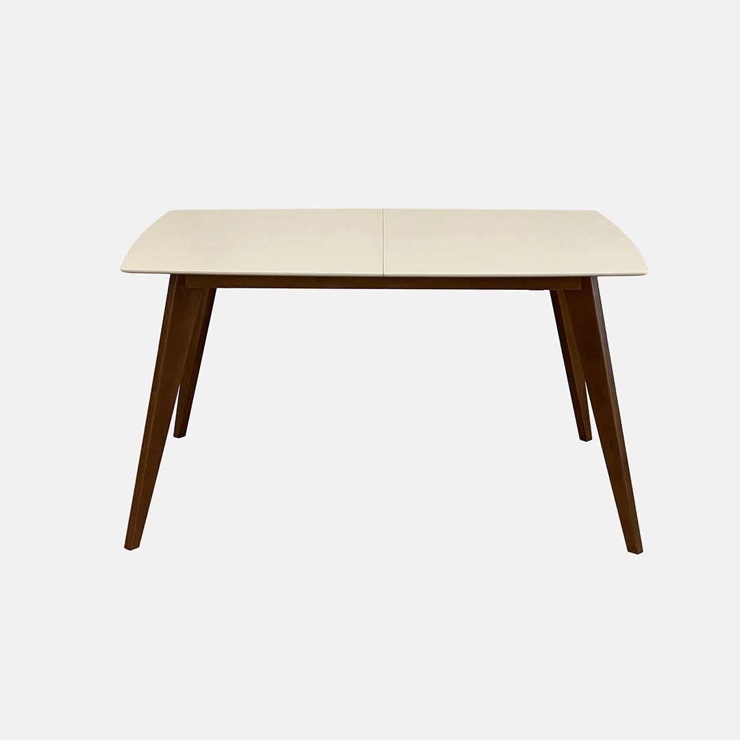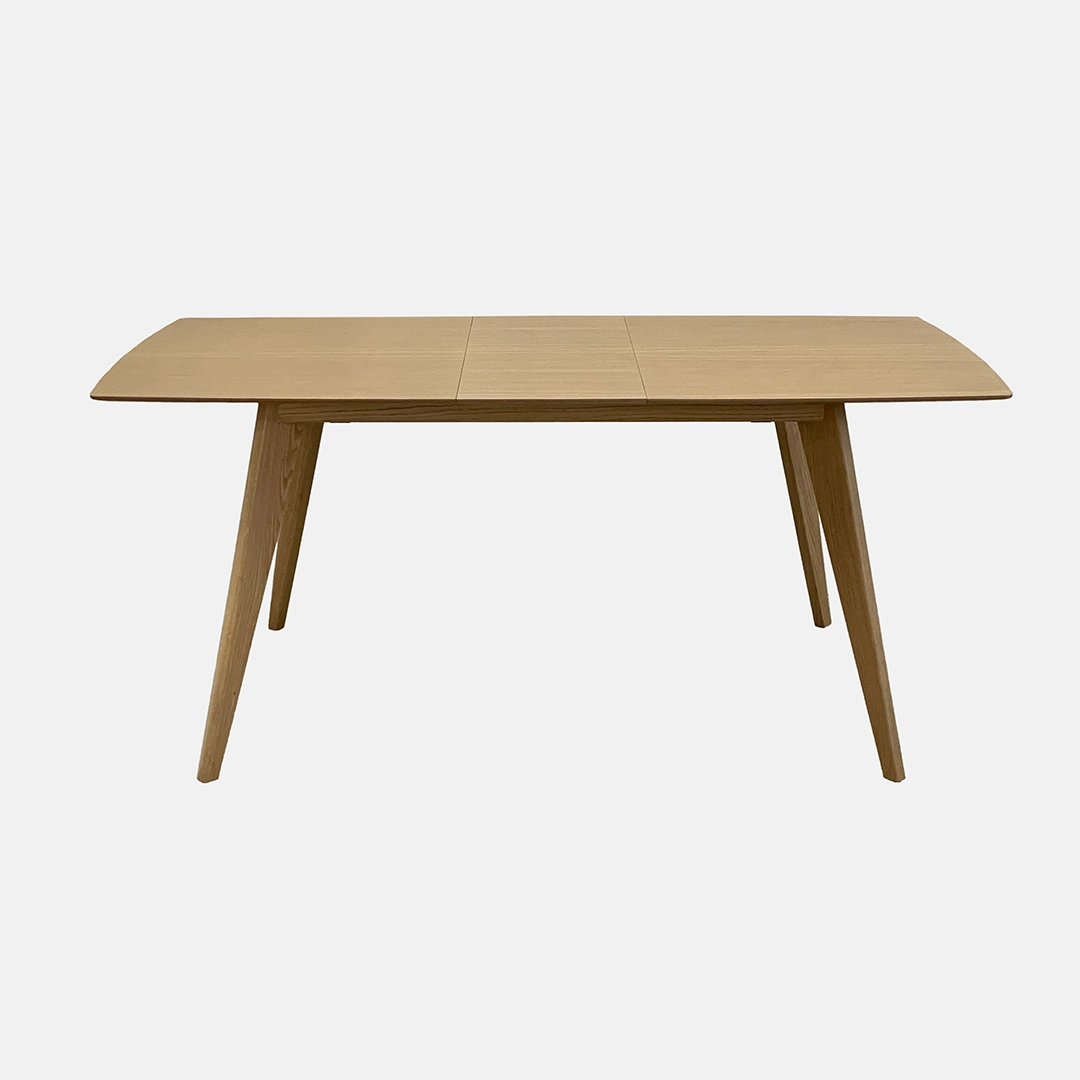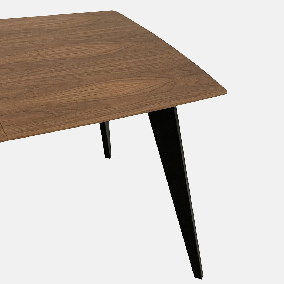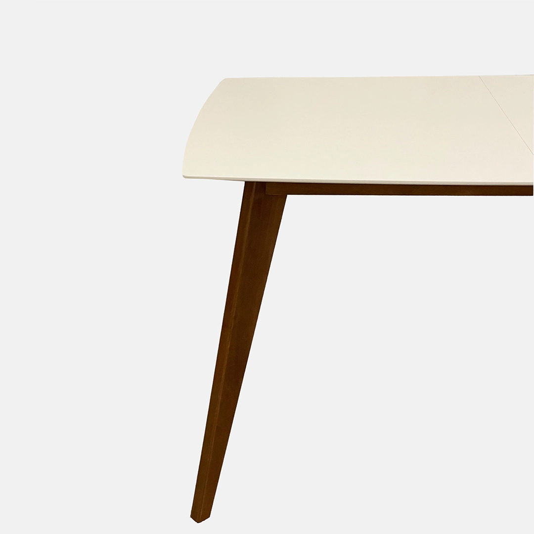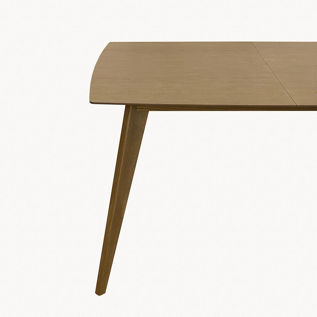 Sa zaobljenim ivicama i kosim čvrstim nogama, ovaj sto donosi mekan i moderan izgled svakoj trpezariji. Ploča stola je napravljena od furniranog MDF-a, a struktura je od punog drveta — dostupna u različitim kombinacijama završnih obrada i nijansi po vašem izboru.