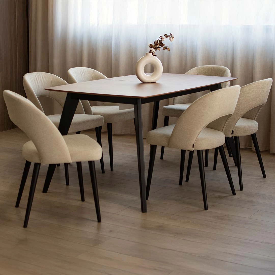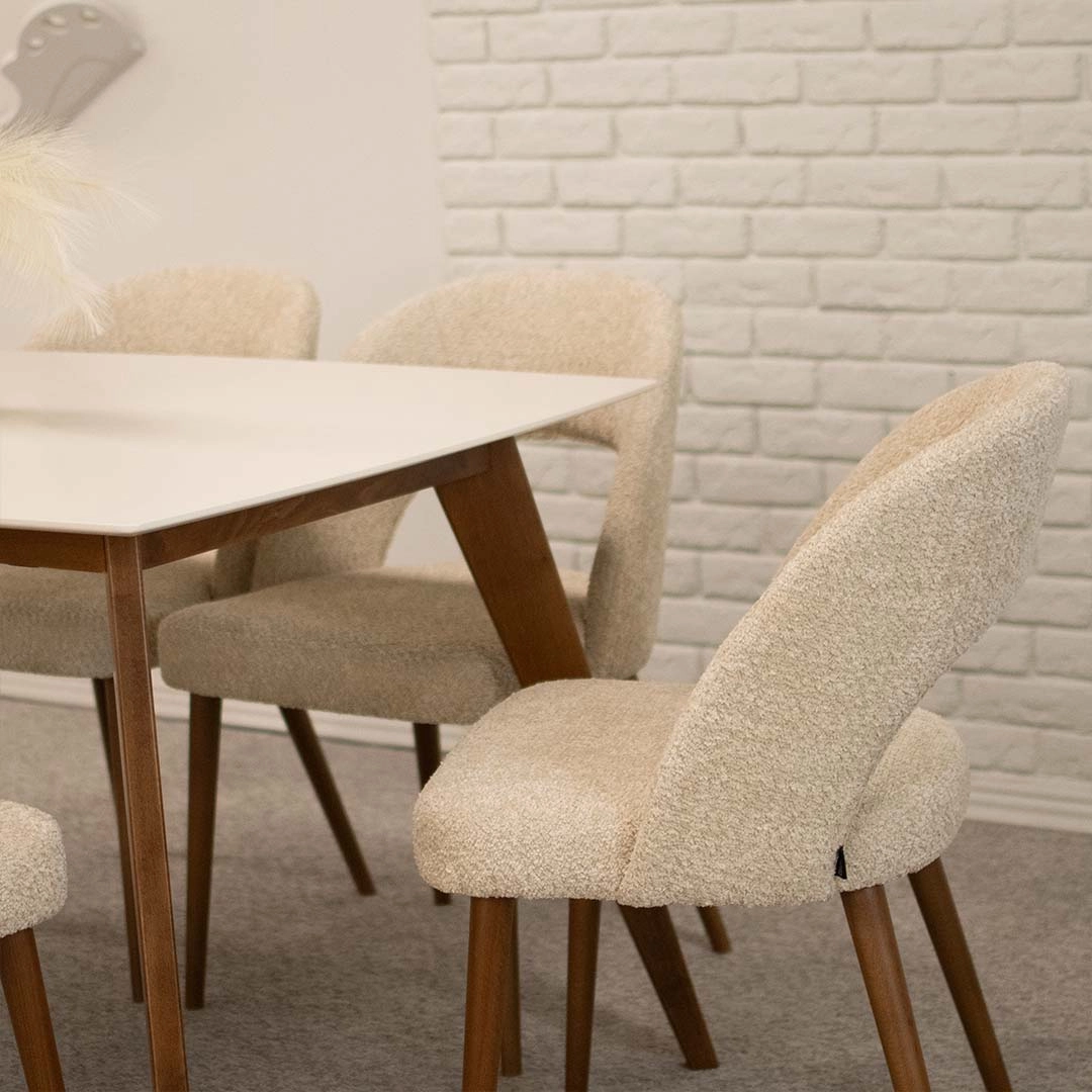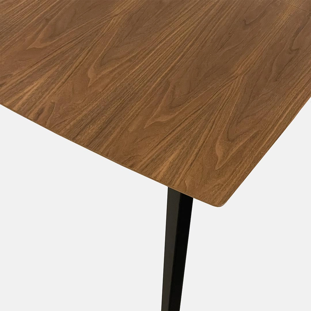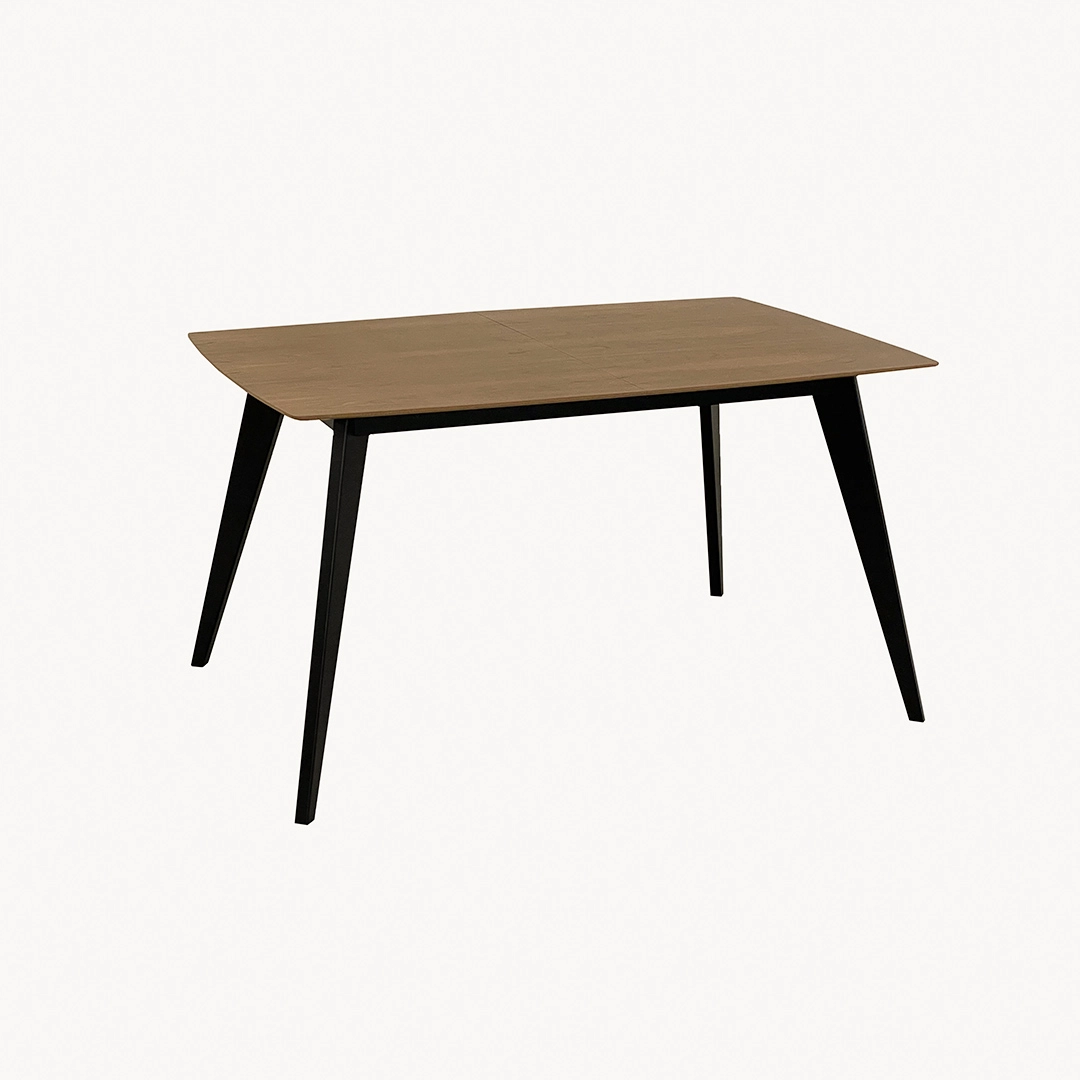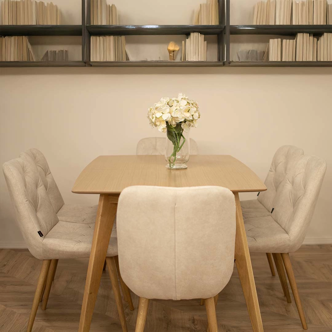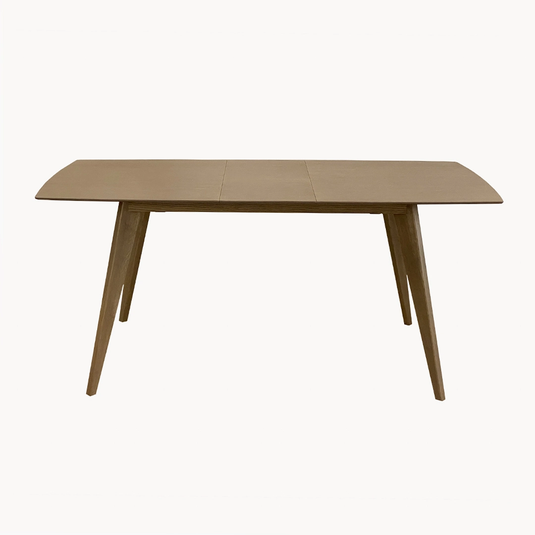 Sa zaobljenim ivicama i kosim čvrstim nogama, ovaj sto donosi mekan i moderan izgled svakoj trpezariji. Ploča stola je napravljena od furniranog MDF-a, a struktura je od punog drveta — dostupna u različitim kombinacijama završnih obrada i nijansi po vašem izboru.