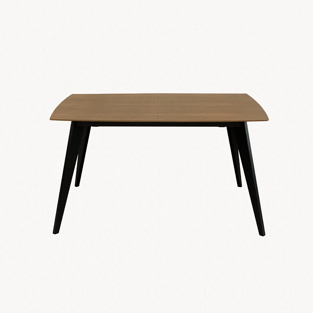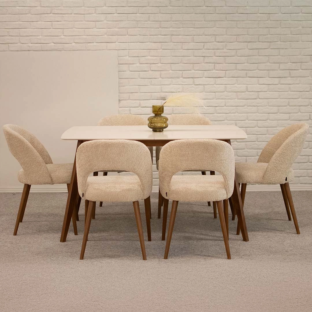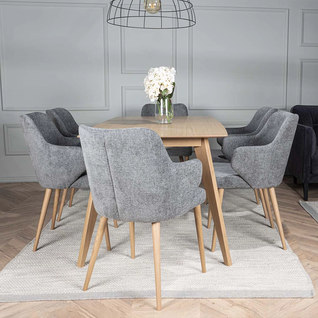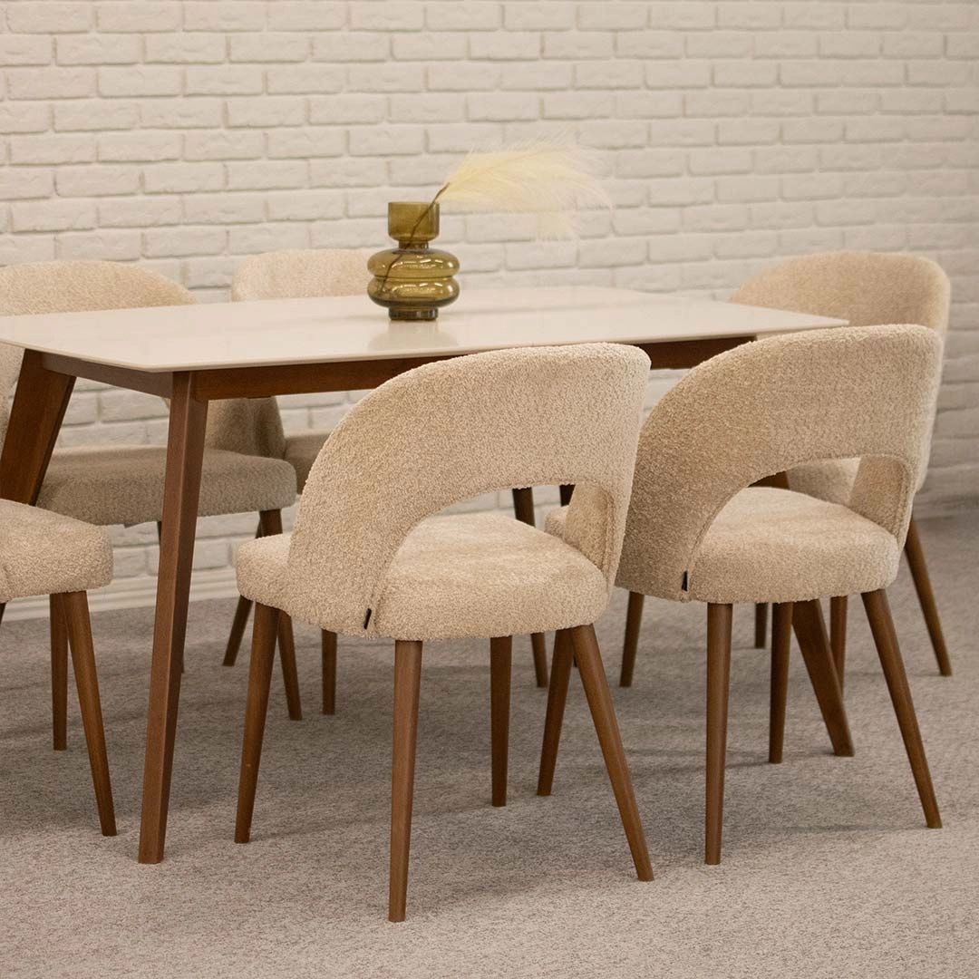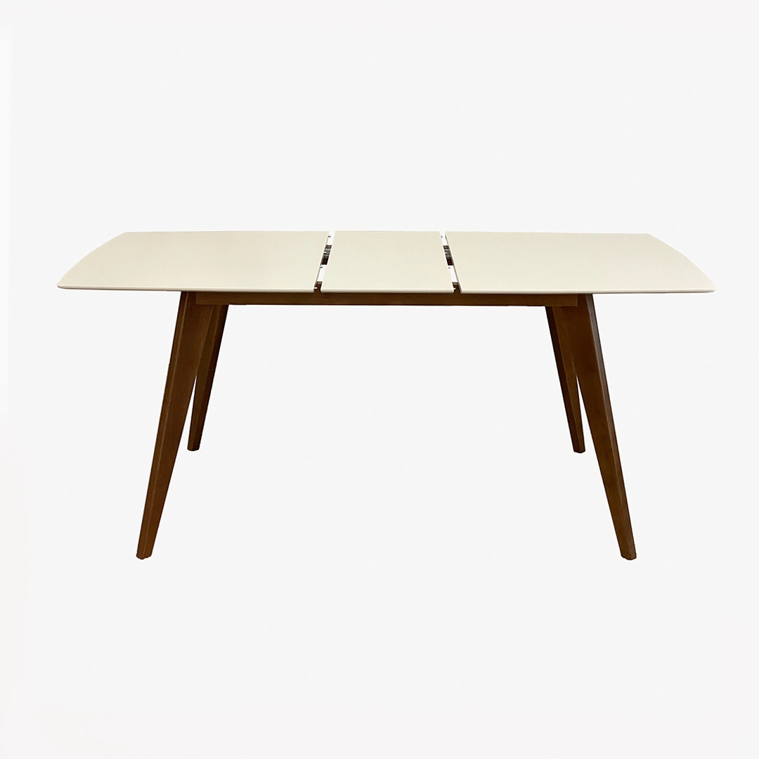 Sa zaobljenim ivicama i kosim čvrstim nogama, ovaj sto donosi mekan i moderan izgled svakoj trpezariji. Ploča stola je napravljena od furniranog MDF-a, a struktura je od punog drveta — dostupna u različitim kombinacijama završnih obrada i nijansi po vašem izboru.